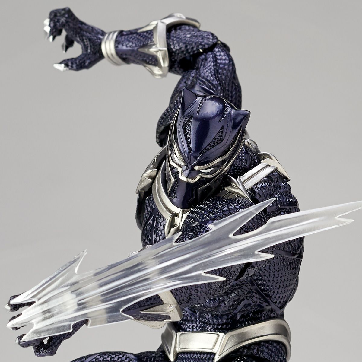 全身の可動ギミックは、黒豹の名にふさわしいしなやかで力強いアクションに焦点をおいてチューニング。各関節の可動範囲の広さはもちろん、深く曲げてもアウトラインの繋がりが崩れない肘、膝の造形や、分割された胴体側面のスイング可動による腕の振り、脛に仕込まれた独自の関節による人体の「しなり」など、コミックならではのデフォルメまでも表現として取り込んだアクションポーズが可能となっています。アクロバティックな戦いぶりを、最高の可動と造形でお楽しみください!!
