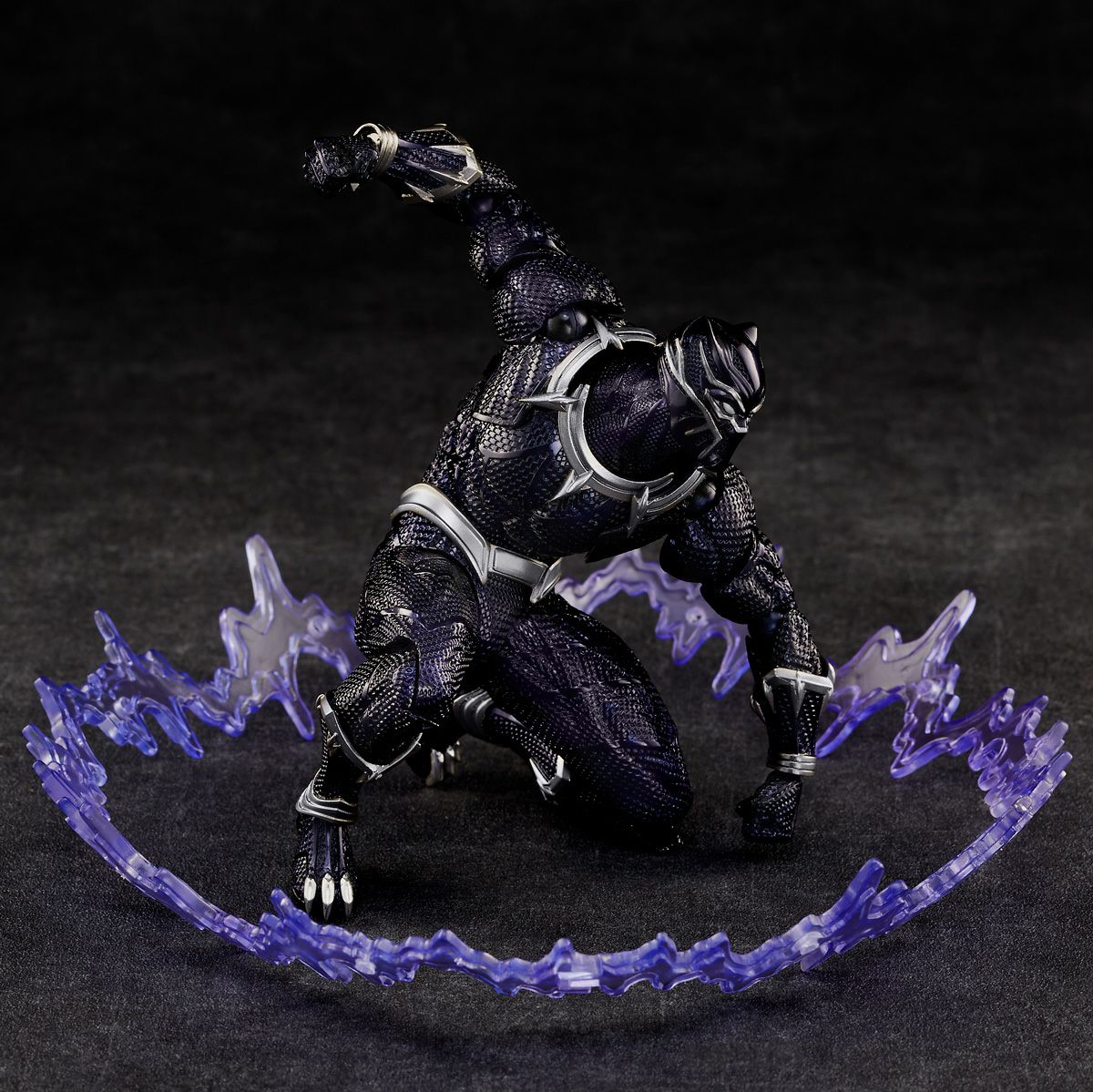 ヴィヴラニウムが編み込まれたアーマースーツは、鍛え上げられた肉体の表現に加えハイテク素材風のディテールを全身くまなくほどこし、メタリックな塗装で夜の闇に溶け込むような漆黒に仕上げました。