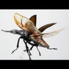 前翅は閉じた状態の「装甲」感を優先して展開状態との差し替え式、実物同様に胸関節を曲げつつ前翅を開く構造も再現しました。