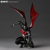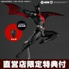今回はコミック初期のカートゥーン調作画スタイルをイメージ。プロポーションのデフォルメを利かせ、スーツのディテールも最低限のアレンジとしています。コウモリを模した翼は、付け根のジョイントに加え中央部のヒンジで可動。踵のスラスター噴射と合わせて空を飛ぶ、身体を包んで潜む、腕に沿わせて武器にするなど、山口式可動の幅広いポージングと合わせて様々なアクションに応用できます。怒り顔と凛々しい素顔の交換用頭部も付属。