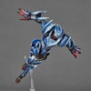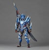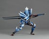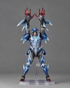ヒロイックなフルフェイスマスク、スマートなスーツ状の鎧に重ねられた装甲パーツなど、複雑なデザインを立体化。冷気を操り霜を纏うルナガロンと同様に白いラインを交えた瑠璃色の装甲を、透明感のある塗装で表現しました。各部の装甲はボールジョイントで接続され、山口勝久が工夫を凝らした独自フレーム内蔵ボディや専用ジョイントの手脚などの可動を最大限に活かせる構造となっています。