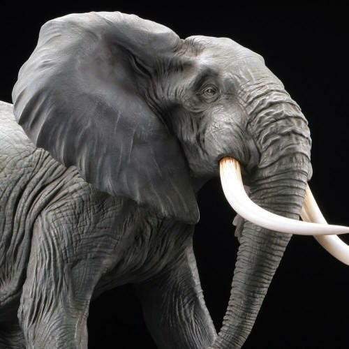 サバンナ、熱帯雨林、砂漠、高地と様々な場所に生息する現存する陸生哺乳類の中で最も大きい草食動物であるアフリカゾウを、動物造形作家の第一人者、松村しのぶが立体化。